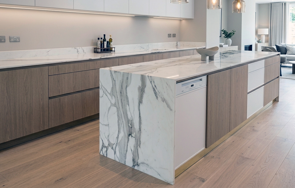 We often supply for High End Residential & Commercial projects all over the United Kingdom. We can supply and Fit any size and thickness of Calacatta and Statuario Slabs in Book-matched Format, Cut-to-size Slabs & Tiles.